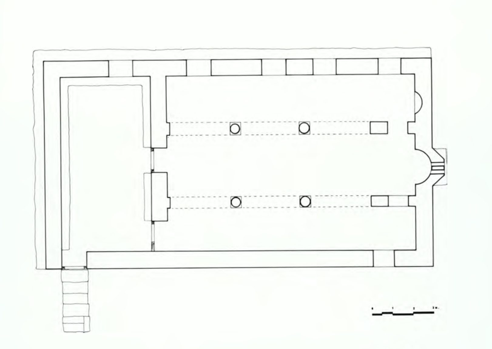 The church of St. Nikolaos, also known as St. Spyridon, is a three-aisled timber-roofed basilica dating back to the 17th c., with an externally semi-hexagonal apse, and a narthex. Each of the arcades separating the church into the three aisles consists of two columns, the pillar wall of the sanctuary and a pilaster on the western wall of the church. Α characteristic element is the absence of an open connection between the northern aisle and the narthex. Access from outside is effected through a doorway on the south-western side of the narthex. A semi-circular niche is curved in the eastern wall of the prothesis, which communicates with the sanctuary through a doorway. The passage to the diaconicon was blocked during a subsequent period. In order to better illuminate the spacious church, large rectangular windows were created at a subsequent time (five on the northern wall and one on the southern wall) which interrupted and destroyed the mural paintings at those places. In order to support the colonnades and construct the floor and masonry, ancient and byzantine sculptures were used as spolia. The decoration of the church in 1617 unfolds in the space of the sanctuary and the northern, southern and western walls. A few post-1617 depictions survive in the narthex.