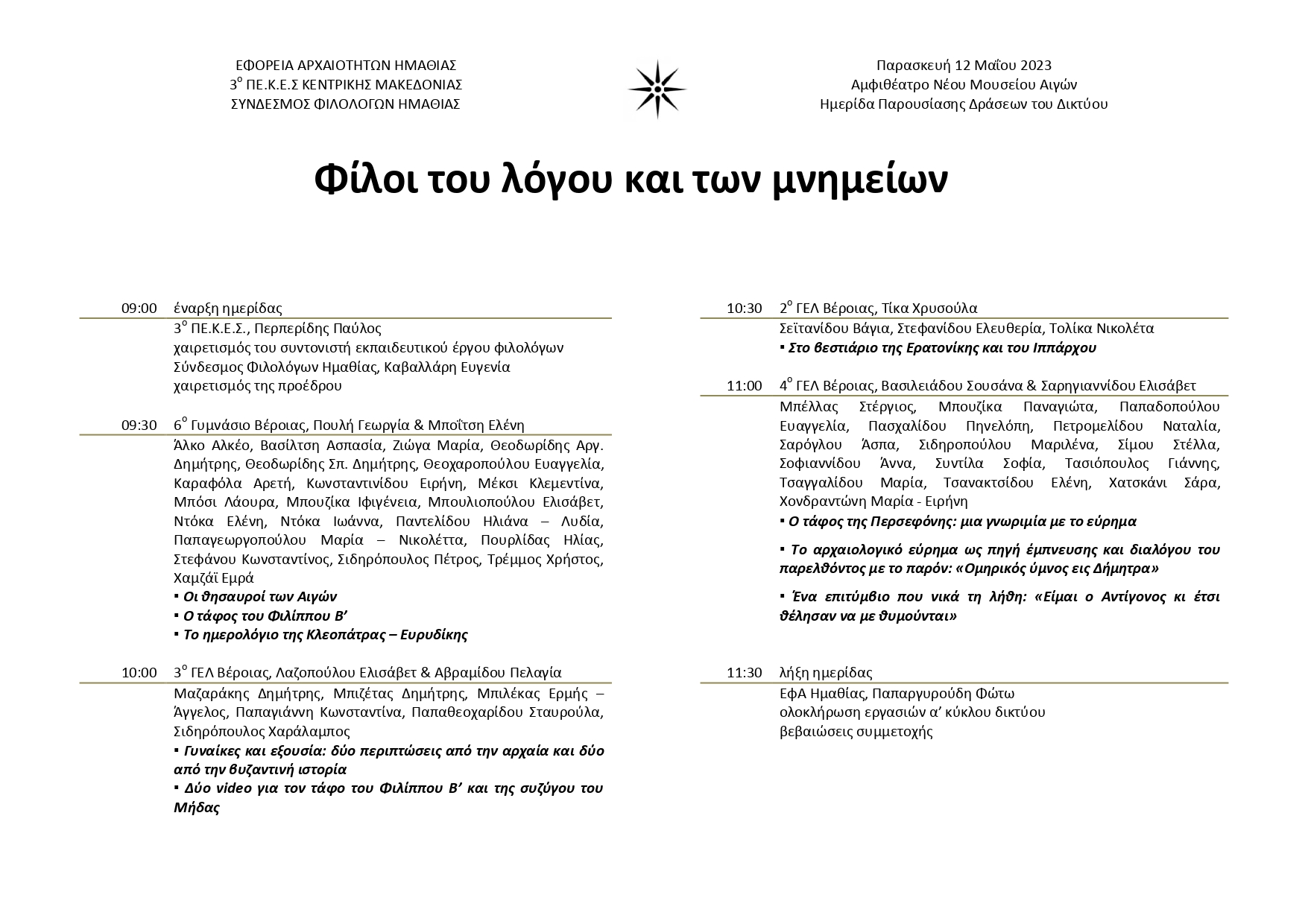 Η Εφορεία Αρχαιοτήτων Ημαθίας, ο Σύνδεσμος Φιλολόγων Ημαθίας και το 3ο ΠΕ.Κ.Ε.Σ. Κεντρικής Μακεδονίας συνδιοργανώνουν ημερίδα για την παρουσίαση των δράσεων του δικτύου «Φίλοι του λόγου και των μνημείων».